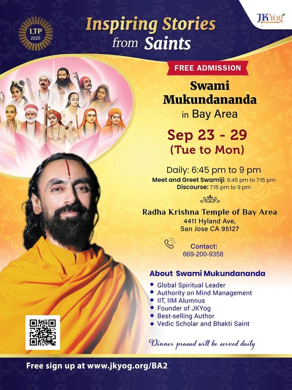 Radha Krishna Temple invites you to ‘Inspiring Stories from Saints’ A 7-Day Discourse with Swami Mukundananda in San Jose!